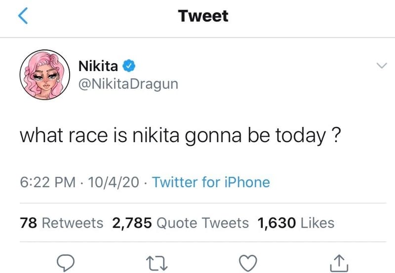 Figure 11. Dragun, Nikita (@NikitaDragun). “what race is nikita gonna be today?”. Twitter, October 4, 2020.